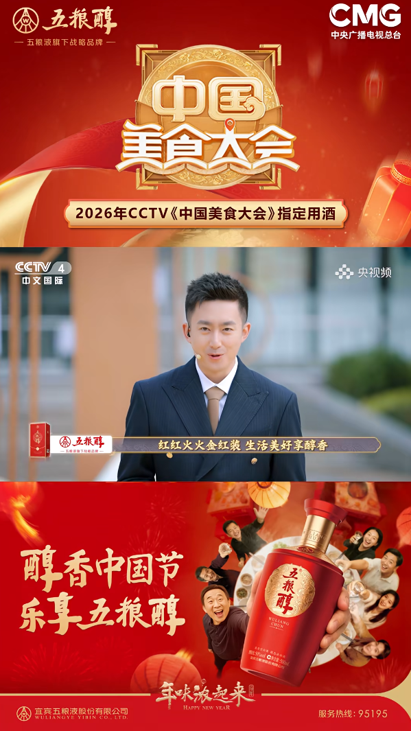 绑定“团圆宴”,五粮醇深耕美食文化中的美好生活。2月7日,五粮醇以“指定用酒”身份深度亮相央视总台《中国美食大会》。通过“美酒+美食”的国民情感纽带,将品牌深度植入家庭团圆饭、朋友聚餐等核心春节消费场景,化身美好生活的陪伴者与风味探索的参与者。配合“红人计划”的线下引导,实现了从文化IP曝光到消费场景共建的无缝衔接。